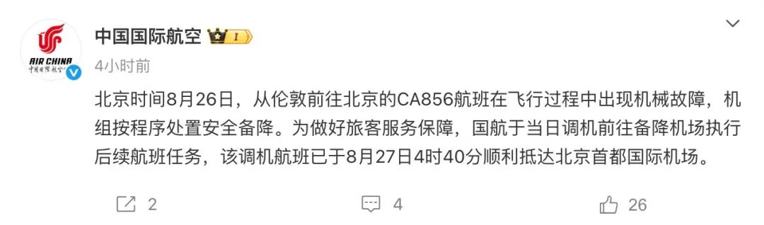 北京时间8月26日,从伦敦前往北京的CA856航班在飞行过程中出现机械故障,机组按程序处置安全备降。
