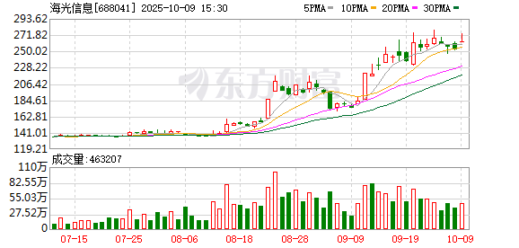 证券时报·数据宝统计显示,海光信息今日收盘价为263.05元,上涨4.14%,日换手率为1.99%,成交额为123.77亿元,全天主力资金净流入1.30亿元,近5日该股累计上涨1.22%,近5日资金合计净流出22.03亿元。